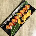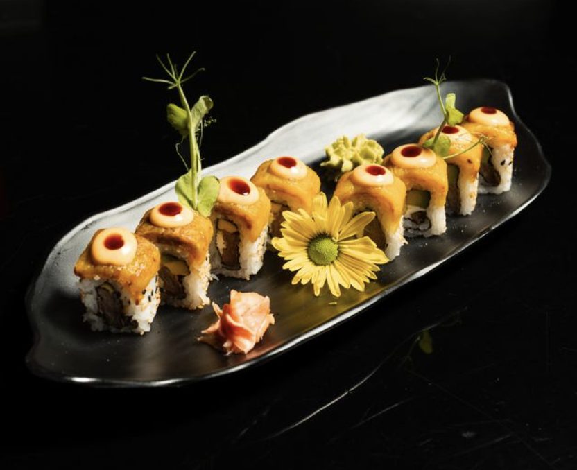 Mamba Roll $22 Camarón tempura, spicy crab, queso crema y plátano amarillo; coronado con anguila, salsa de anguila, ají amarillo, cebollines y crocante de quinoa. MÁS DETALLES